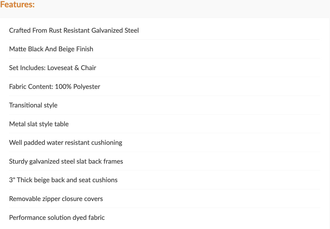 Relax on your deck, patio, or porch in complete comfort with the well-padded, water-resistant cushioning of this stylish 4 piece outdoor accent set. Two plush chairs, a comfortable loveseat, and a metal slat-style table are made for refreshing drinks and conversation by the garden. Sturdy galvanized steel slat back frames make the perfect foundation for durable 3" thick beige back and seat cushions, complete with removable zipper-closure covers for simple maintenance. Performance solution-dyed fabric stands up to the sun and rain, ensuring you always have a front row seat to the beauty of nature, right in your own backyard.